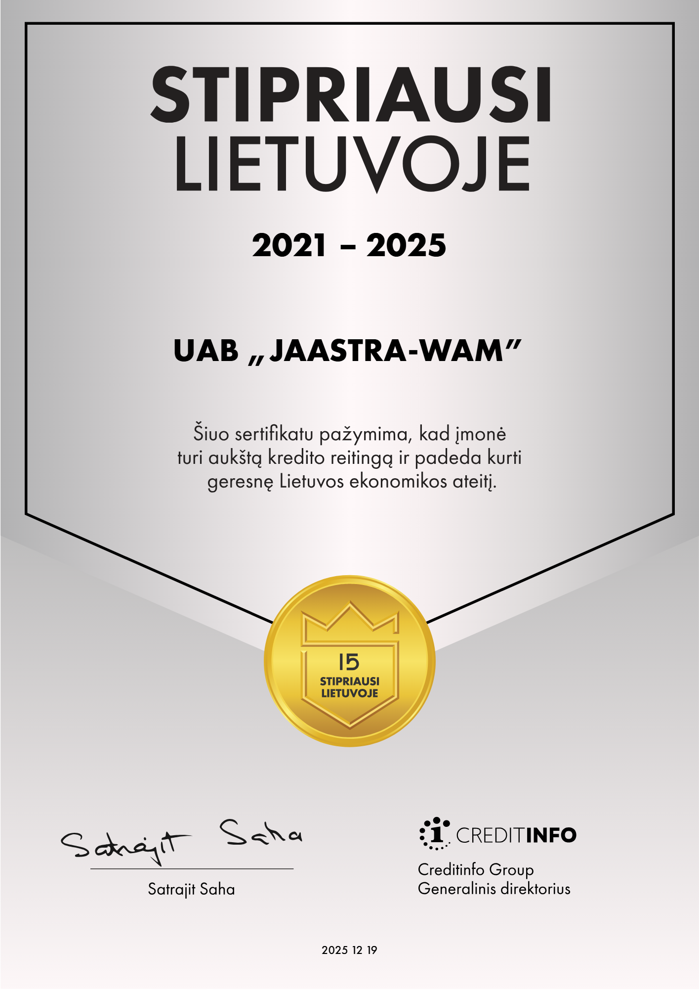 Įmonė „JAASTRA-WAM“ siūlo platų nerūdijančio plieno technologinio apdirbimo įrangos asortimentą maisto, gėrimų, kosmetikos, chemijos ir farmacijos pramonei, taip pat patirtį, reikalingą sprendžiant gamybos užduotis. Įmonė parengs Jums komercinį pasiūlymą, kuris leis minimaliomis sąnaudomis įsigyti, sumontuoti ir paleisti aukščiausios kokybės įrangą, kuri veiks ilgus metus.